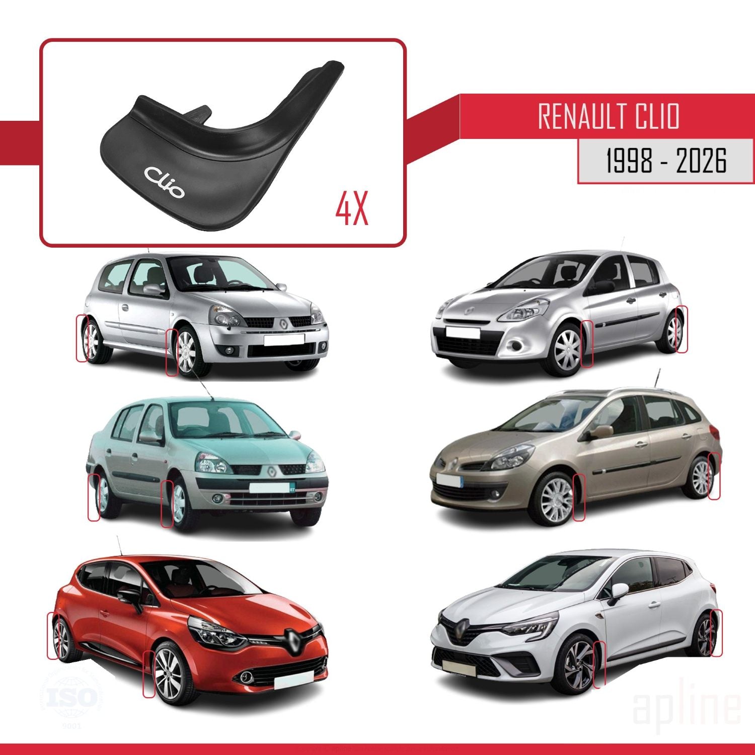 Renault Clio 1998-2026 Mudguards Vehicle Front Rear Set 4 Pcs Black