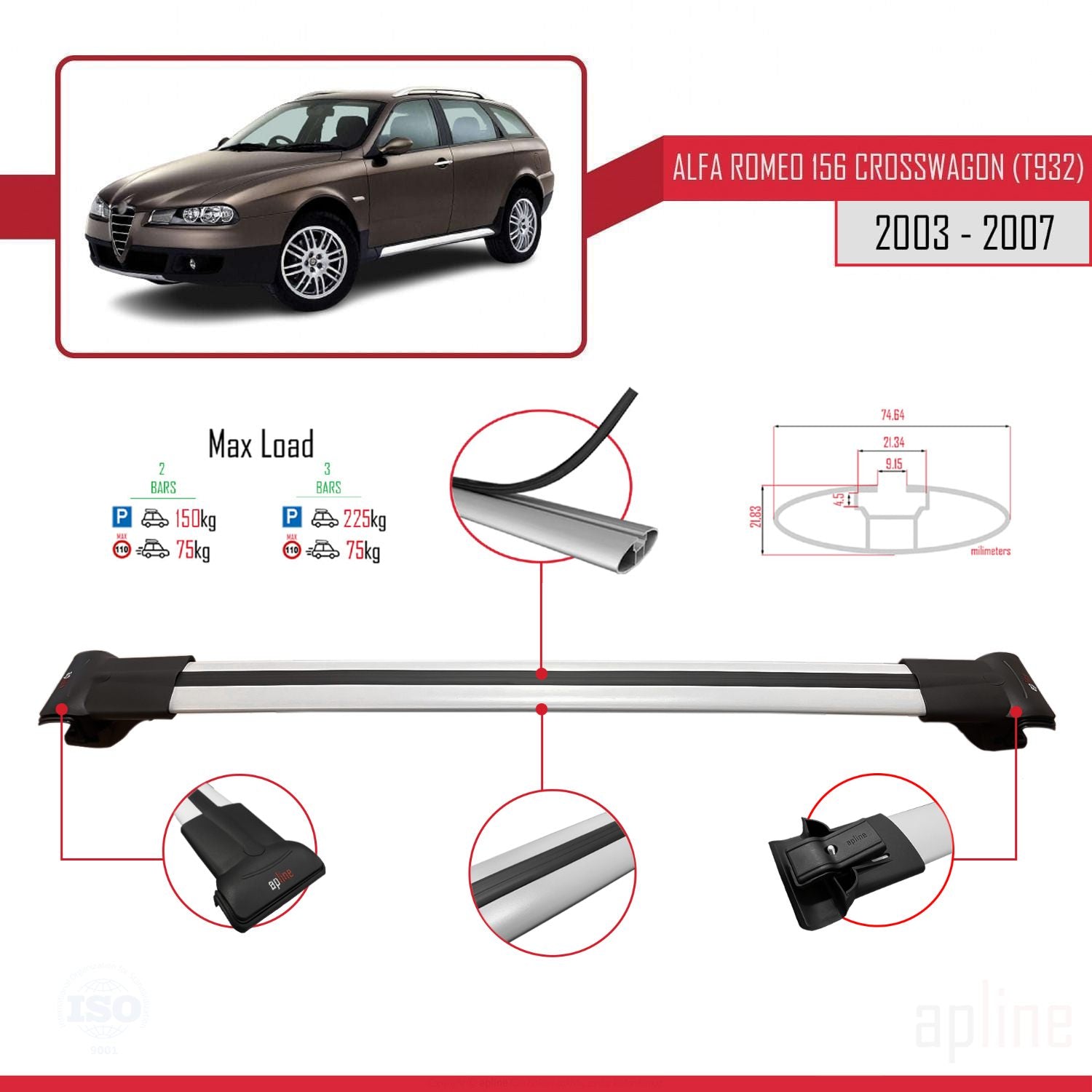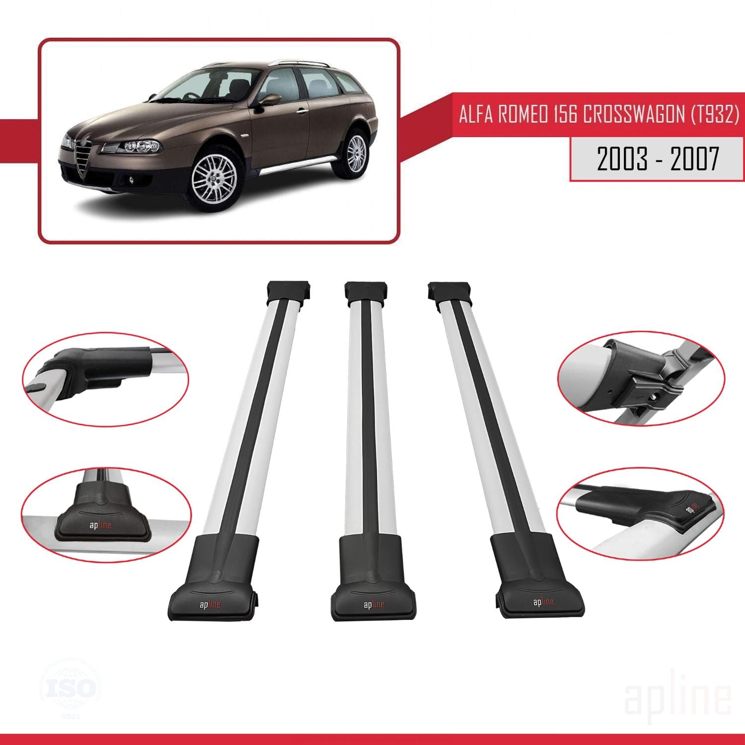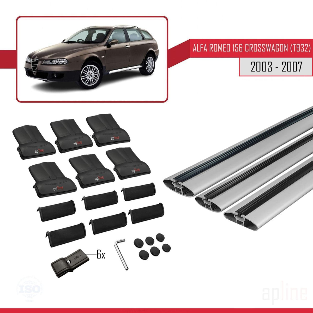 Alfa Romeo 156 (T932) Crosswagon 2003-2007 fly Model Car Roof Rack Cross Bar Grey Aluminium 3 Bars