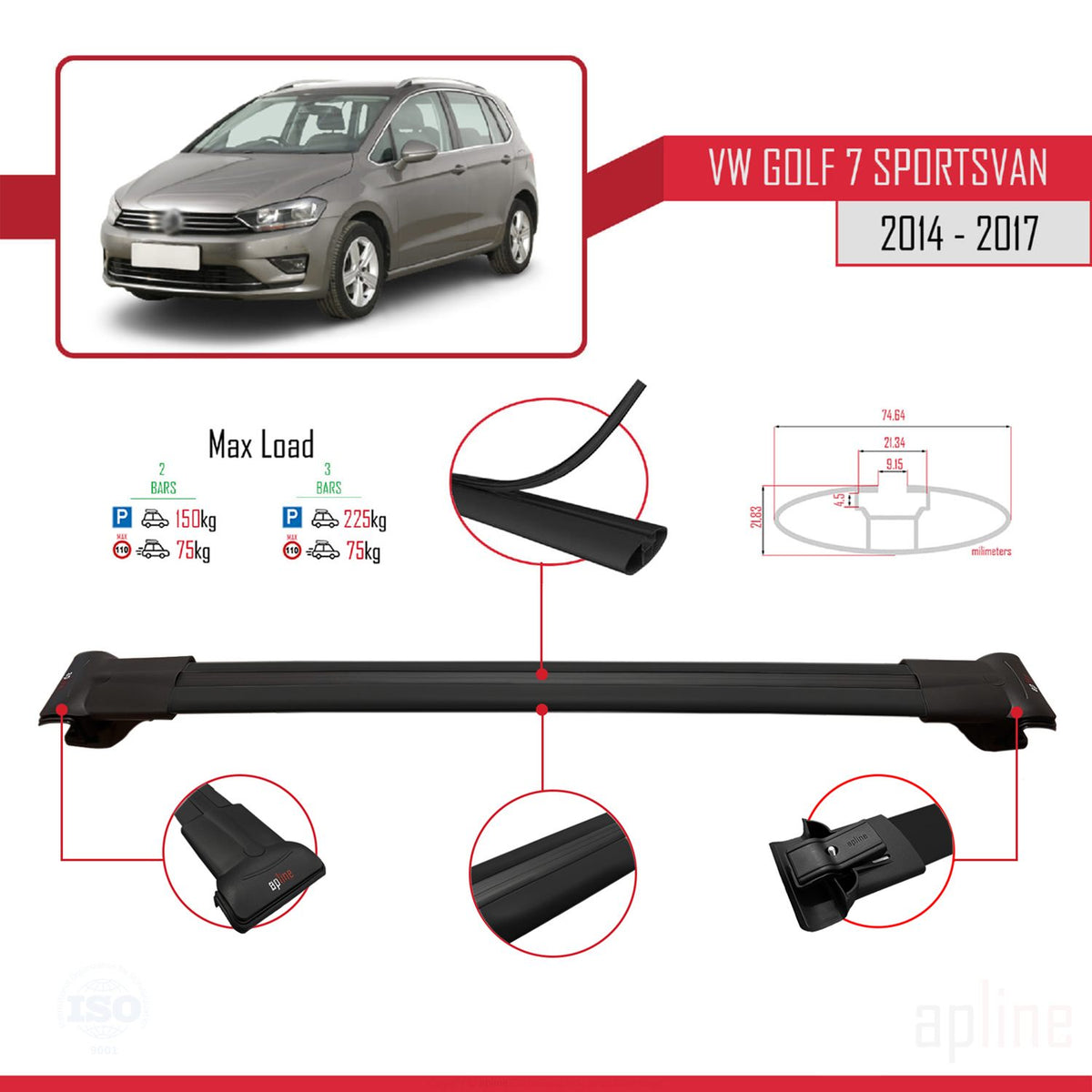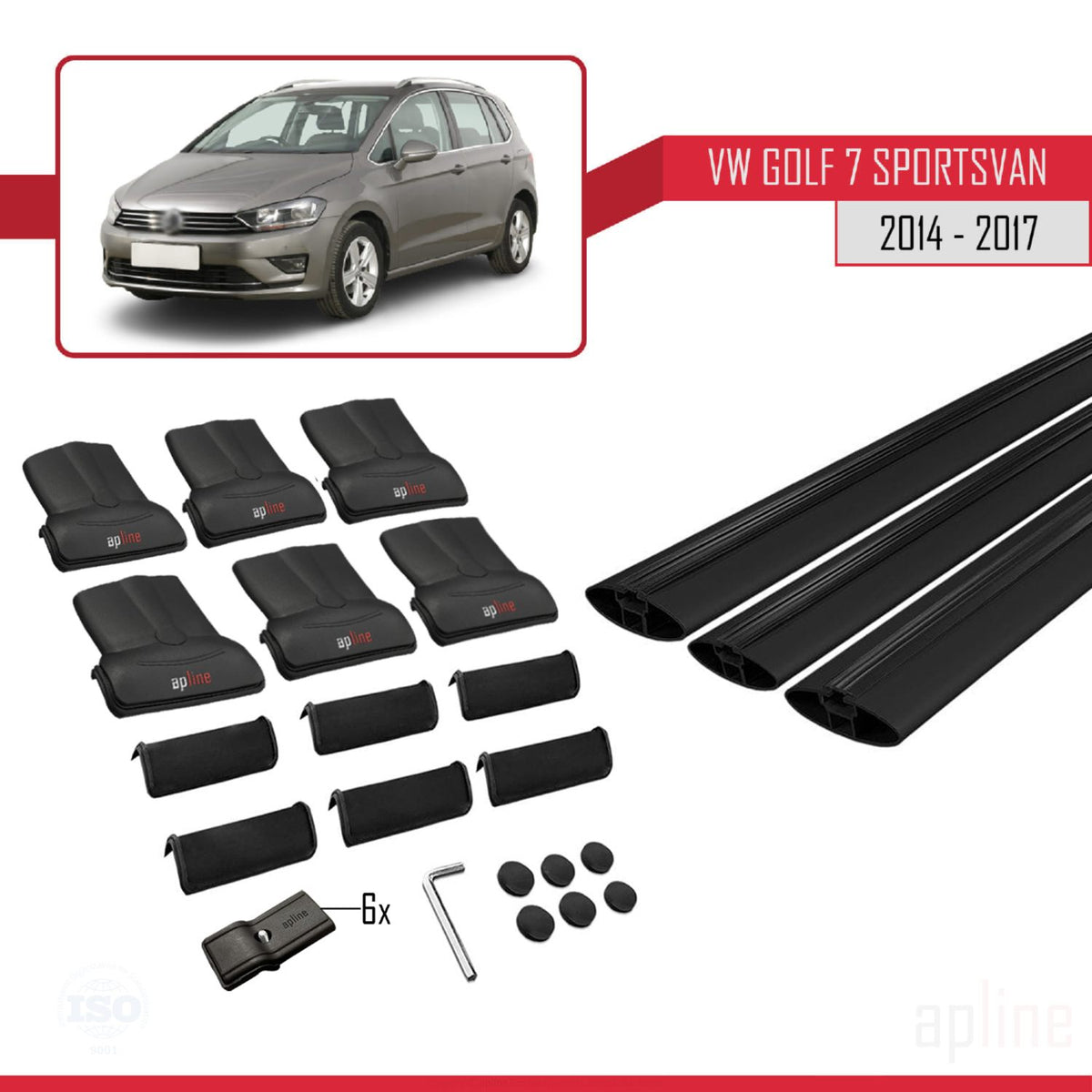 Volkswagen Golf Sportvan 2014-2017 fly Model Car Roof Rack Cross Bar Black Aluminium 3 Bars