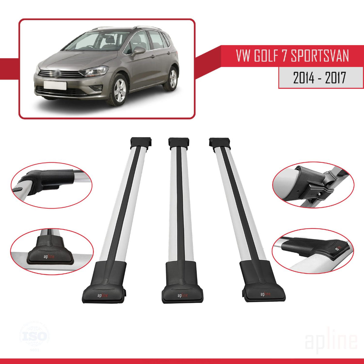 Volkswagen Golf Sportvan 2014-2017 fly Model Car Roof Rack Cross Bar Grey Aluminium 3 Bars