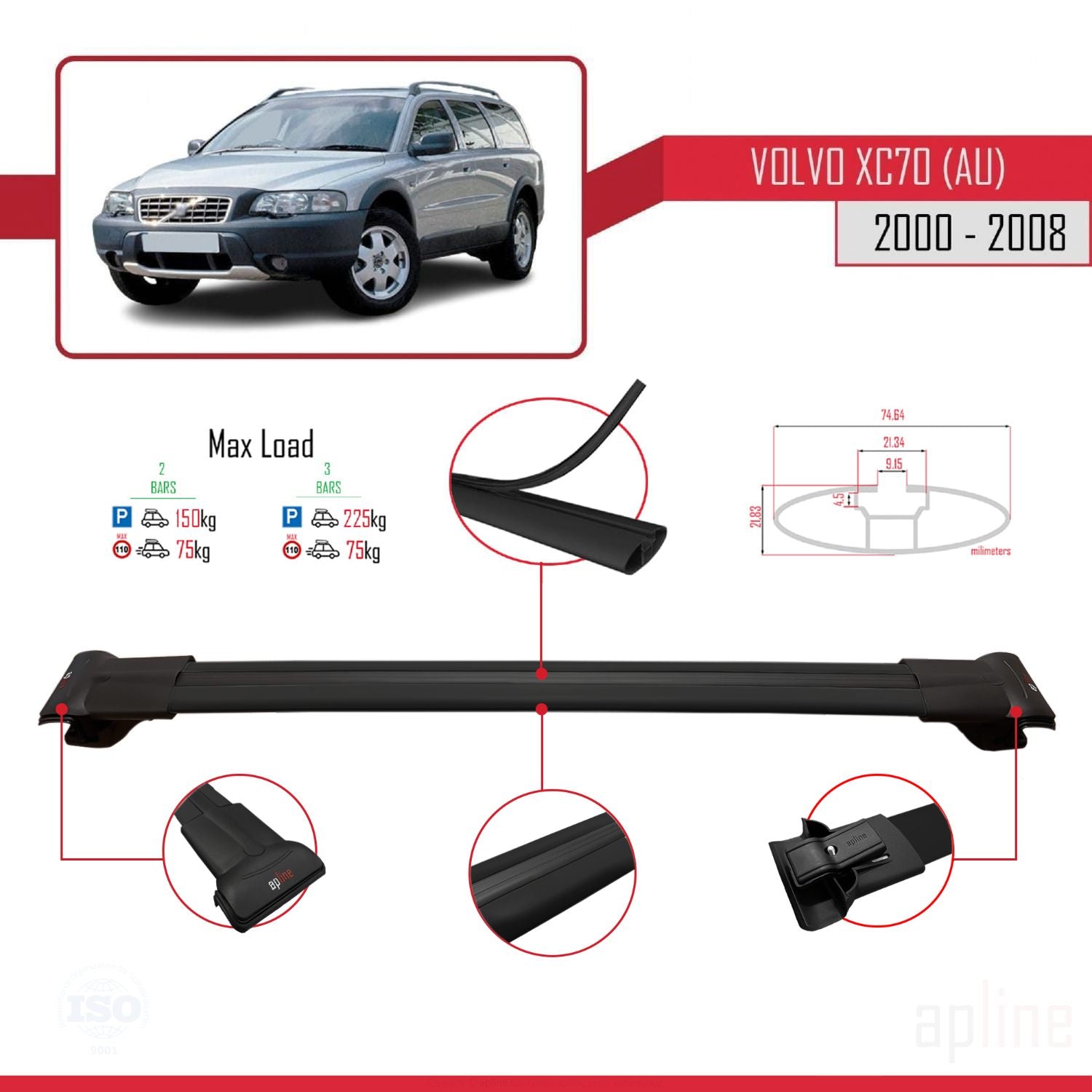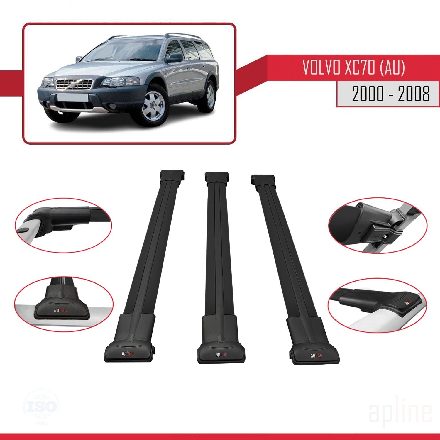 Volvo XC70 (P2) 2000-2007 fly Model Car Roof Rack Cross Bar Black Aluminium 3 Bars