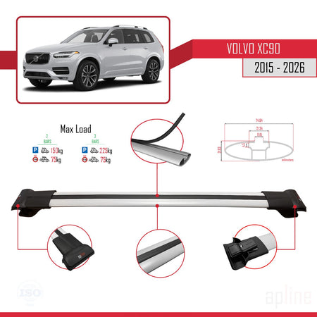 Volvo XC90 II 2015-2025 fly Model Car Roof Rack Cross Bar Grey Aluminium 3 Bars